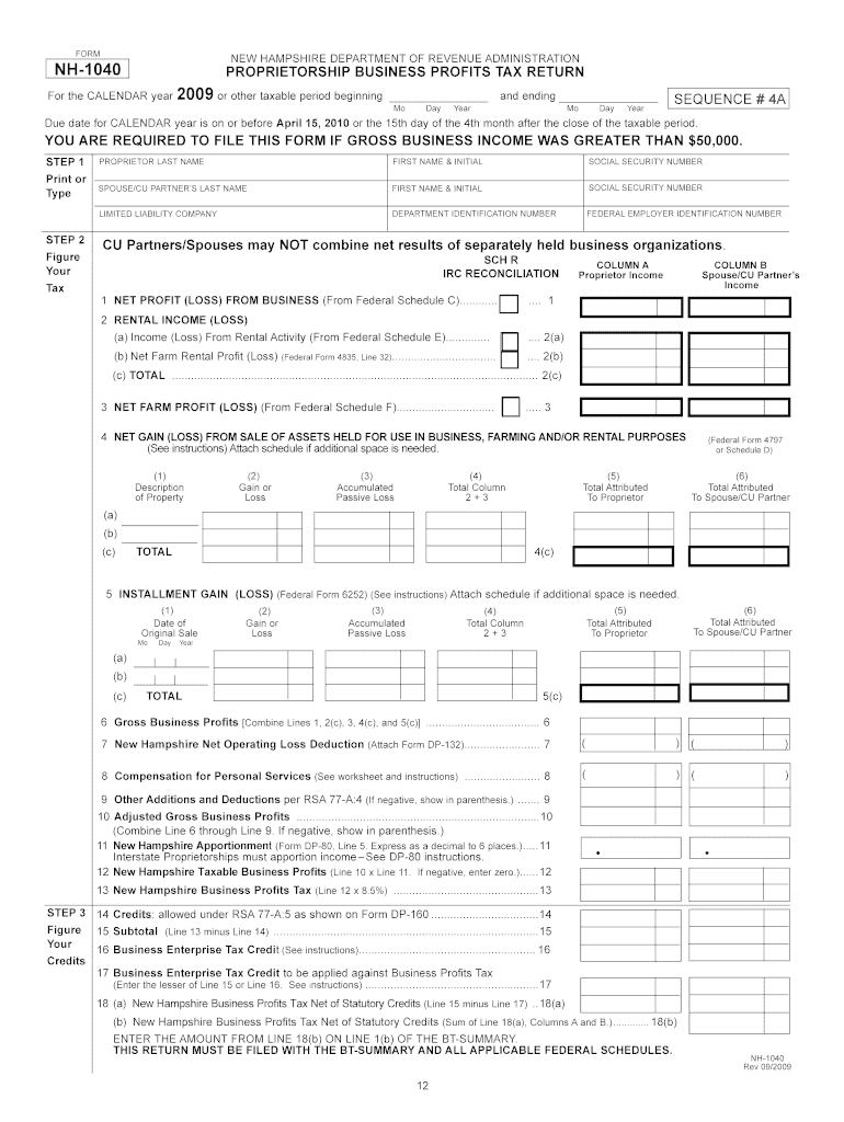 Print and Reset Form NEW HAMPSHIRE DEPARTMENT OF REVENUE ADMINISTRATION NH-1040 PROPRIETORSHIP BUSINESS PROFITS TAX RETURN For the CALENDAR year 2009 or other taxable period beginning and ending Mo