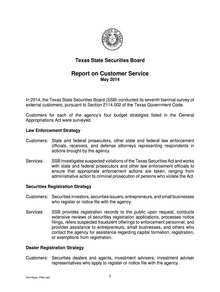 Get the free H:Customer Service Survey-2014-WIPReport2014 Report_FINAL.wpd - ssb state tx