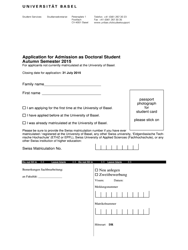 Student Services Studiensekretariat Petersplatz 1 Postal CH-4001 Basel Telephone +41 (0)61 267 30 23 Fax +41 (0)61 267 30 35 www.unibas.ch/studseksupport Application for Admission as Doctoral Student
