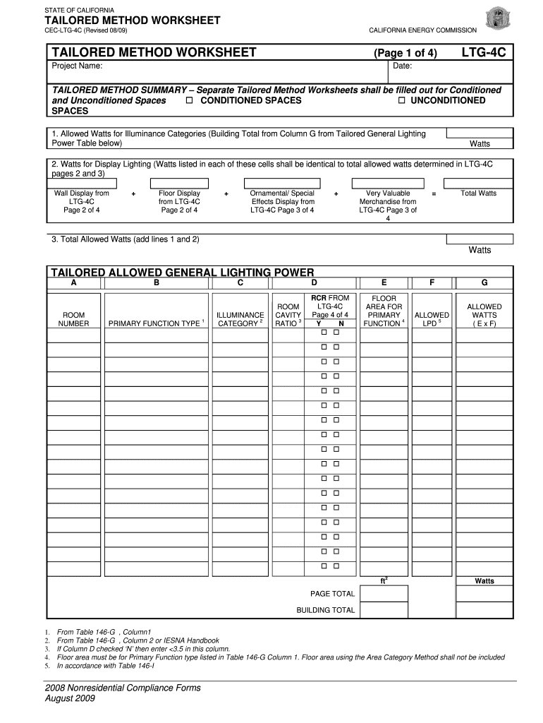 STATE OF CALIFORNIA TAILORED METHOD WORKSHEET CEC-LTG-4C (Revised 08/09) CALIFORNIA ENERGY COMMISSION TAILORED METHOD WORKSHEET (Page 1 of 4) Project Name: LTG-4C Date: TAILORED METHOD SUMMARY Separate