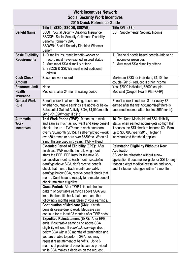 Work Incentives Network Social Security Work Incentives 2015 Quick Reference Guide Benefit Name Basic Eligibility Requirements Cash Check Amount Resource Limit Health Insurance General Work Rule Automatic
