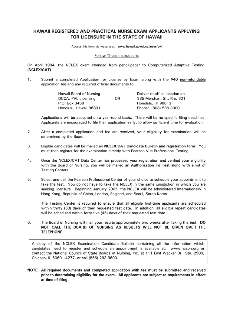 HAWAII REGISTERED AND PRACTICAL NURSE EXAM APPLICANTS APPLYING FOR LICENSURE IN THE STATE OF HAWAII Access this form via website at: www.hawaii.gov/dcca/areas/pvl Follow These Instructions On April