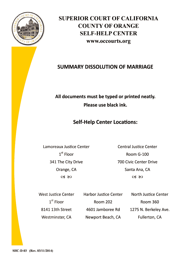 SUPERIOR COURT OF CALIFORNIA COUNTY OF ORANGE SELF-HELP CENTER www.occourts.org SUMMARY DISSOLUTION OF MARRIAGE All documents must be typed or printed neatly. Please use black ink. Self? Help Center