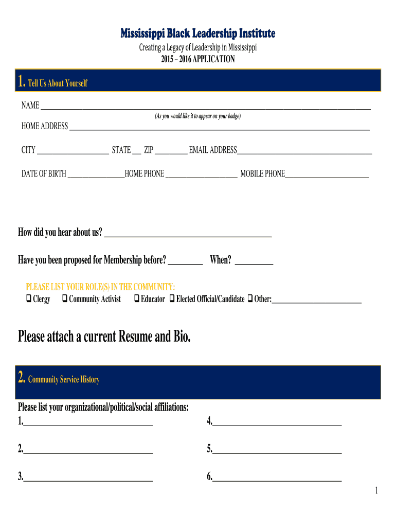 Mississippi Black Leadership Institute Creating a Legacy of Leadership in Mississippi 2015 2016 APPLICATION 1. Tell Us About Yourself NAME (As you would like it to appear on your badge) HOME ADDRESS