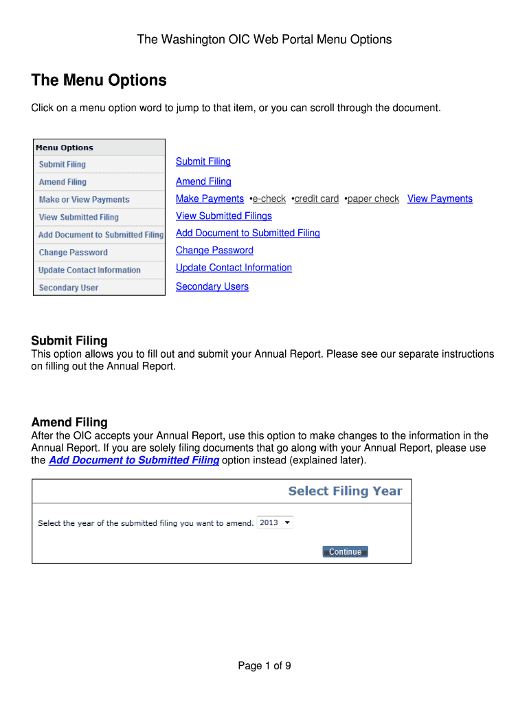 The Washington OIC Web Portal Menu Options The Menu Options Click on a menu option word to jump to that item, or you can scroll through the document. Submit Filing Amend Filing Make Payments e-check