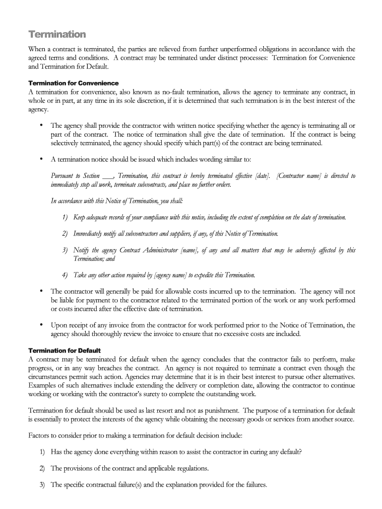 Termination When a contract is terminated, the parties are relieved from further unperformed obligations in accordance with the agreed terms and conditions. A contract may be terminated under distinct