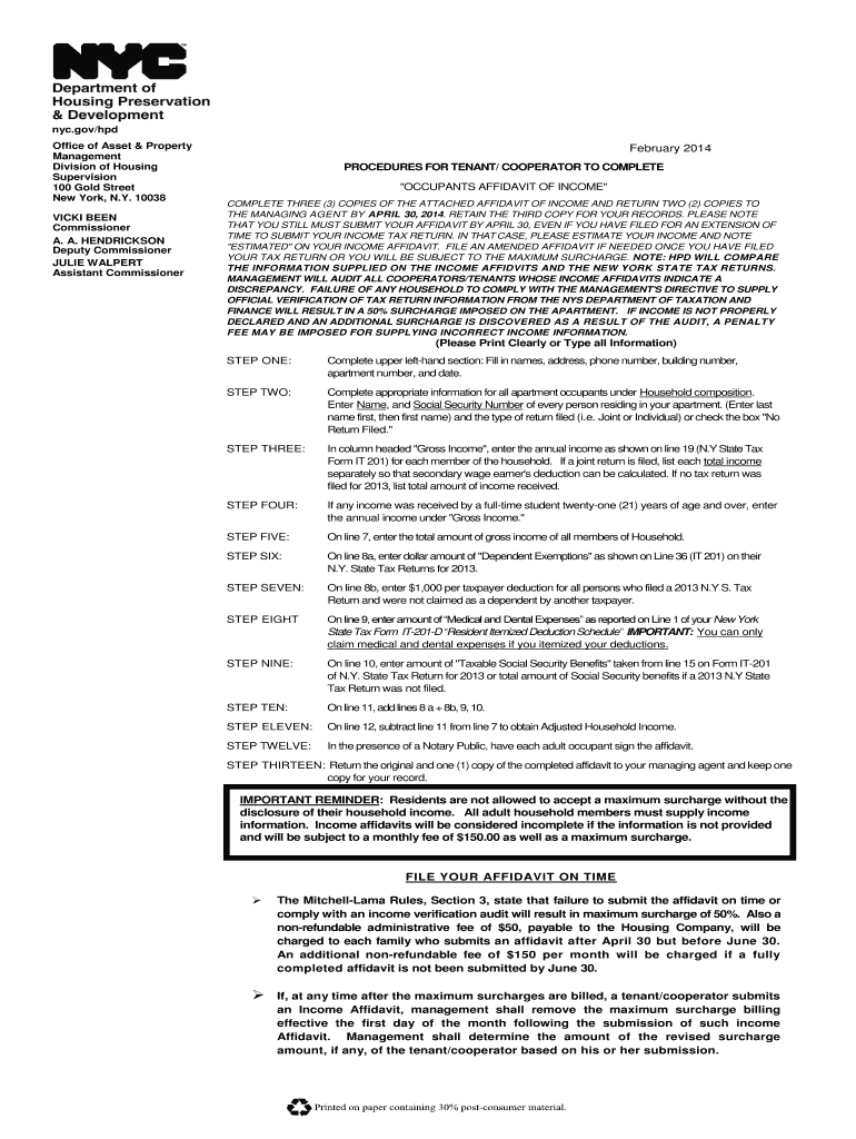 Nyc.gov/hpd Office of Asset & Property Management Division of Housing Supervision 100 Gold Street New York, N.Y. 10038 VICKI BEEN Commissioner A. A. HENDRICKSON Deputy Commissioner JULIE ALPERT Assistant