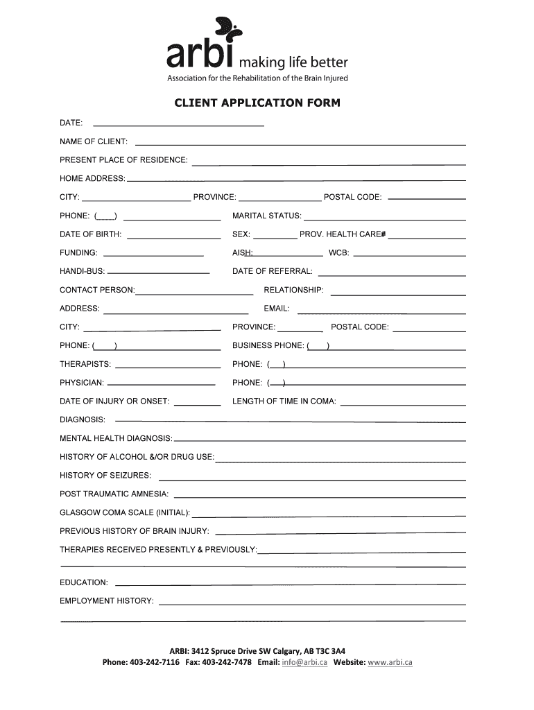 CLIENT APPLICATION FORM DATE: NAME OF CLIENT: PRESENT PLACE OF RESIDENCE: HOME ADDRESS: CITY: PROVINCE: POSTAL CODE: PHONE: () MARITAL STATUS: DATE OF BIRTH: SEX: FUNDING: FISH: HANDICAPS: DATE OF
