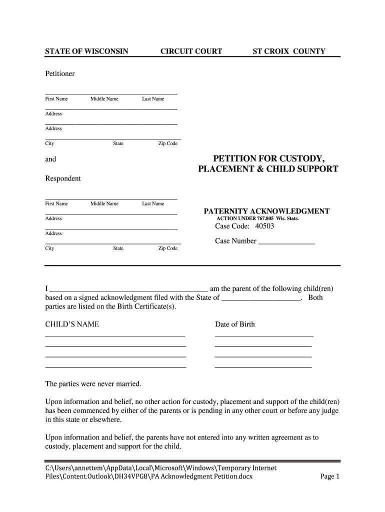 STATE OF WISCONSIN CIRCUIT COURT ST CROIX COUNTY Petitioner First Name Middle Name Last Name Address City State Zip Code PETITION FOR CUSTODY, PLACEMENT & CHILD SUPPORT and Respondent First Name Middle