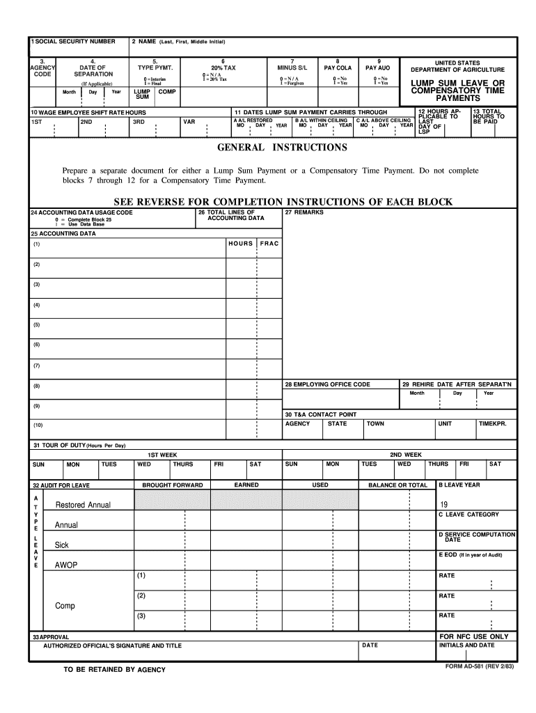 The USDA Lump Sum Payment Form, specifically Form AD-581, facilitates the processing of payments, ensuring employees receive their due compensation efficiently. This document is crucial for handling various payment types, including lump sum payments and compensatory time payments.