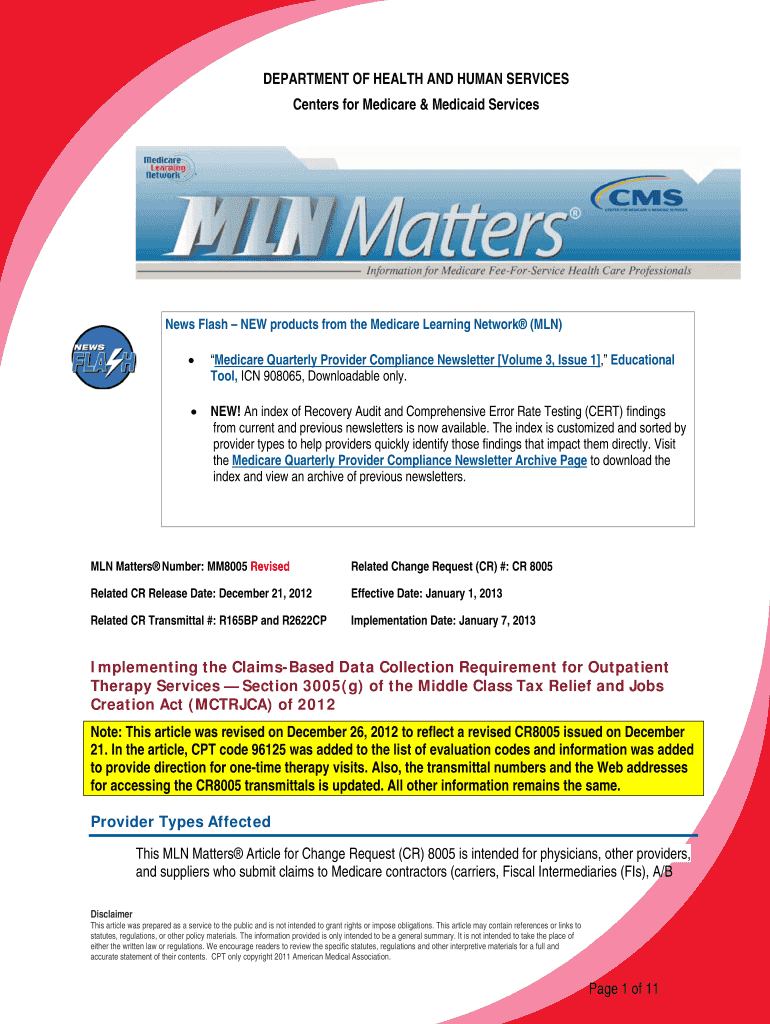 DEPARTMENT OF HEALTH AND HUMAN SERVICES Centers for Medicare & Medicaid Services News Flash NEW products from the Medicare Learning Network (MAN) Medicare Quarterly Provider Compliance Newsletter