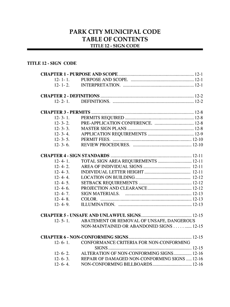 PARK CITY MUNICIPAL CODE TABLE OF CONTENTS TITLE 12 SIGN CODE TITLE 12 — SIGN CODE CHAPTER 1 PURPOSE AND SCOPE ................................................................... 12-1 12 1 – 1.