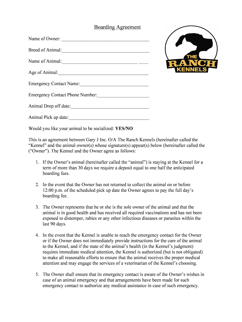 Boarding Agreement Name of Owner: Breed of Animal: Name of Animal: Age of Animal: Emergency Contact Name: Emergency Contact Phone Number: Animal Drop off date: Animal Pick up date: Would you like