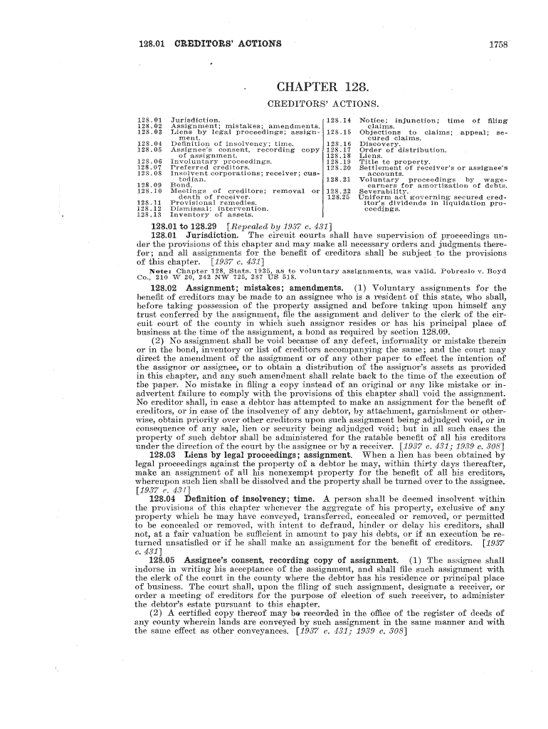 128,01 CREDITORS ACTIONS 1758 CHAPTER 128. CREDITORS ACTIONS. 128.01 128.02 128.03 128.04 128.05 128.06 128.07 128.08 128.09 128.10 128.11 128.12 128.13 Jurisdiction. 128.14 Assignment; mistakes;
