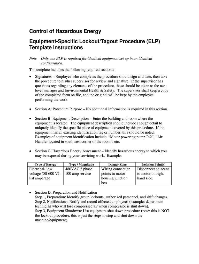Equipment-Specific Lockout/Ragout Procedure (ELP). Template Instructions. Note Only one ELP is required for identical equipment set up in an identical.