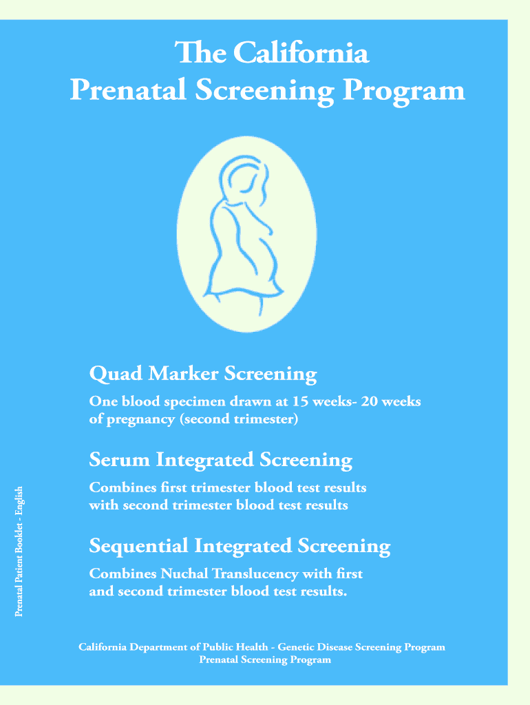 The California Prenatal Screening Program Quad Marker Screening One blood specimen drawn at 15 weeks- 20 weeks of pregnancy (second trimester) Prenatal Patient Booklet English Serum Integrated Screening