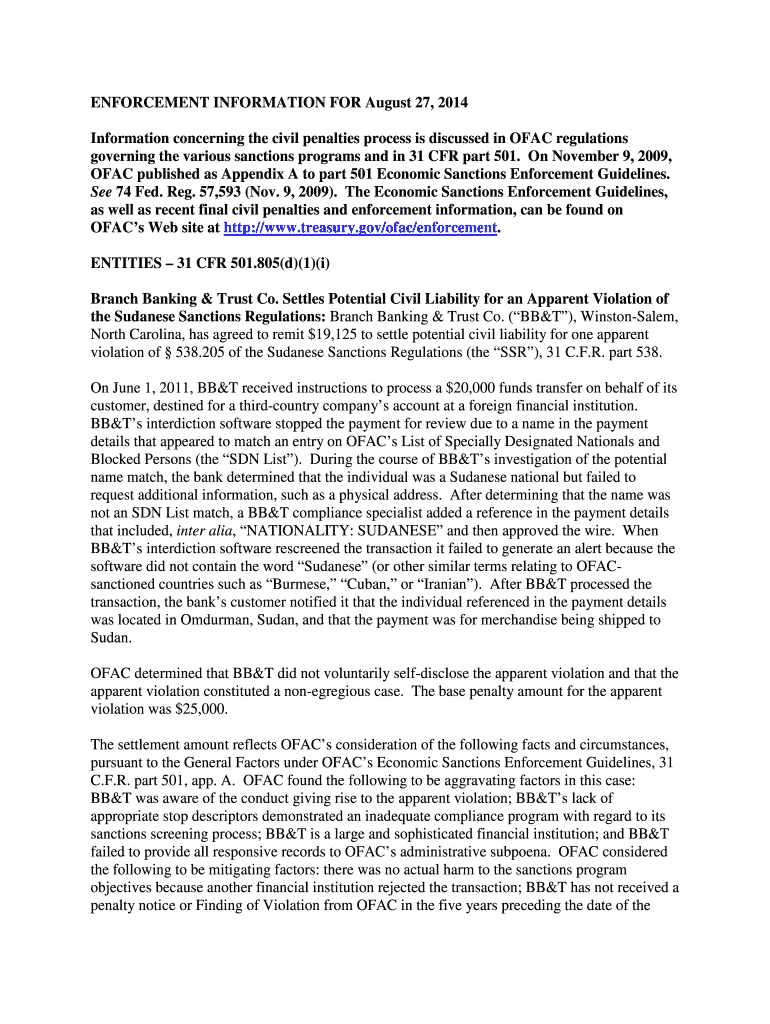 Get the free ENFORCEMENT INFORMATION FOR August 27, 2014 Information ... - treasury