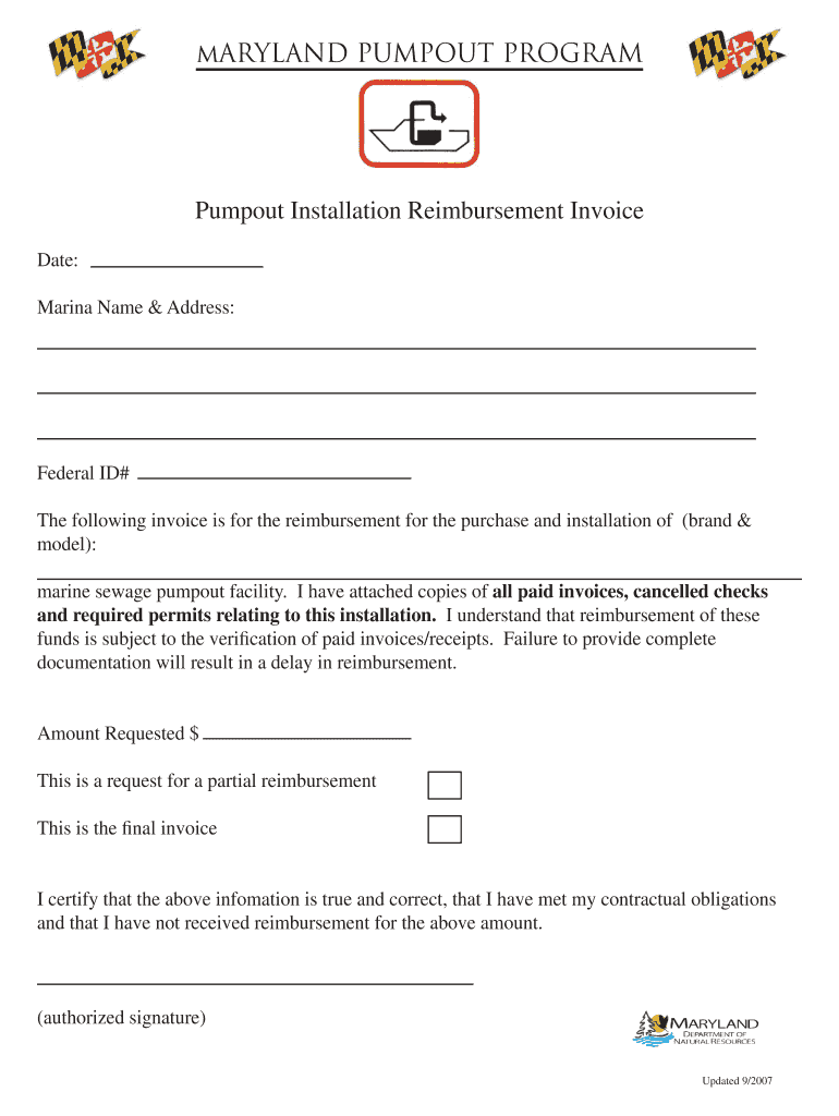 MARYLAND POMPOUS PROGRAM Pump out Installation Reimbursement Invoice Date: Marina Name & Address: Federal ID# The following invoice is for the reimbursement for the purchase and installation of (brand