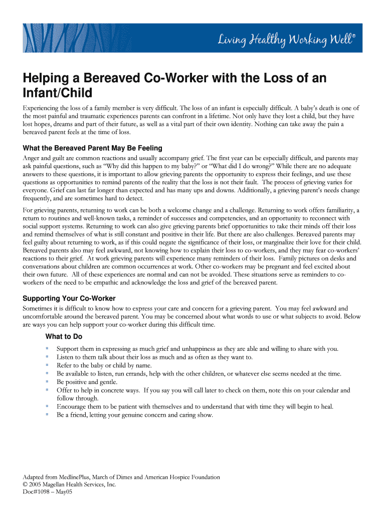 Helping a Bereaved Co-Worker with the Loss of an Infant/Child Experiencing the loss of a family member is very difficult. The loss of an infant is especially difficult. A baby s death is one of the