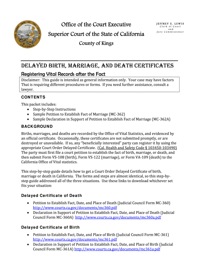 Office of the Court Executive Superior Court of the State of California JEFFREY E. LEWIS Clerk of Court and Jury Commissioner County of Kings DELAYED BIRTH, MARRIAGE, AND DEATH CERTIFICATES Registering