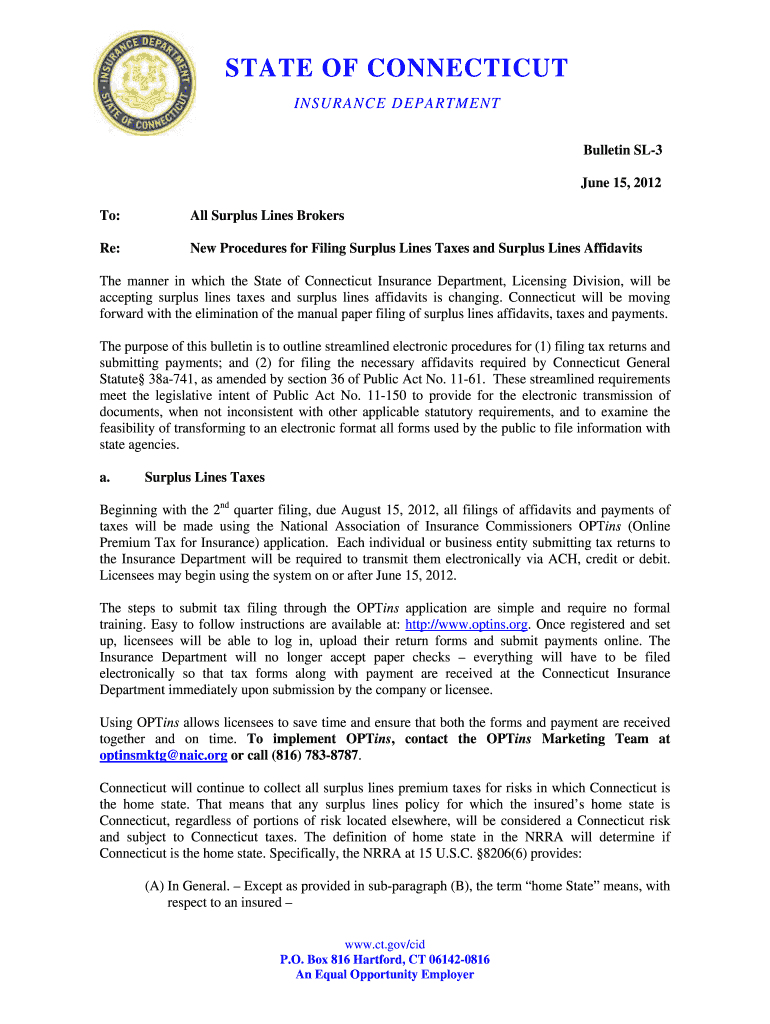 STATE OF CONNECTICUT INSURANCE DEPARTMENT Bulletin SL3 June 15, 2012, To: All Surplus Lines Brokers Re: New Procedures for Filing Surplus Lines Taxes and Surplus Lines Affidavits The manner in which