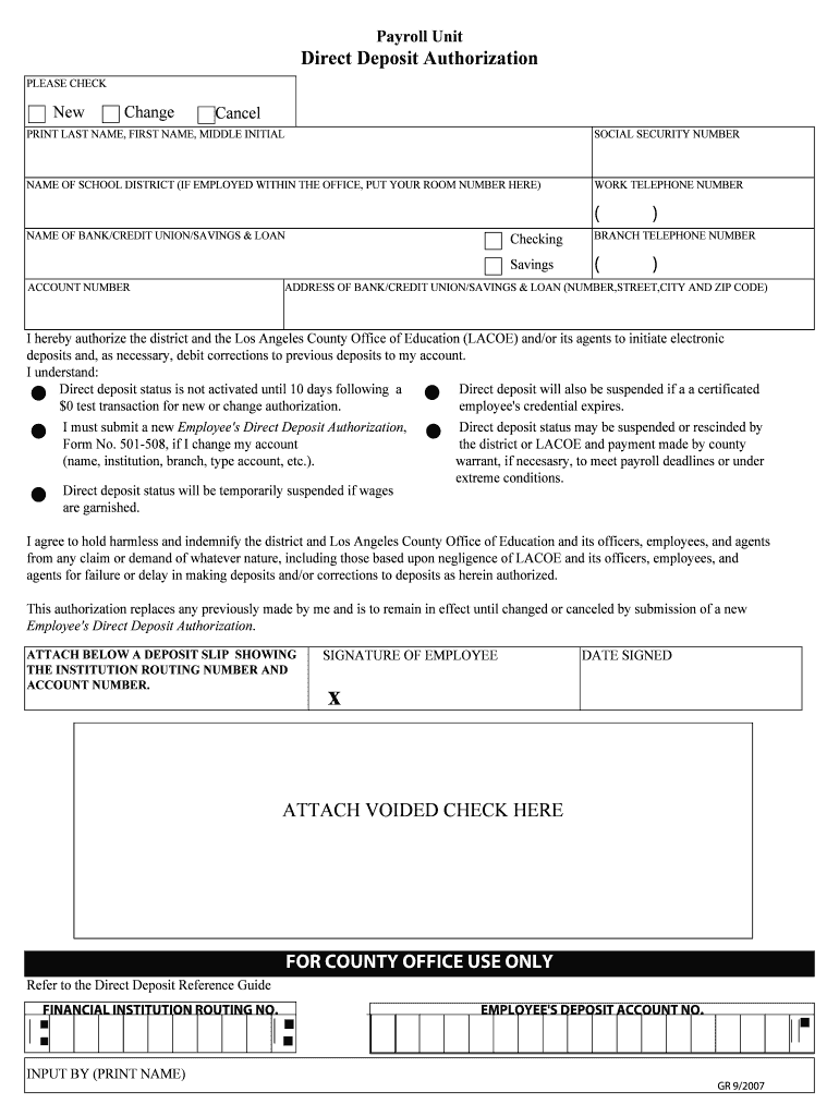 Payroll Unit Direct Deposit Authorization PLEASE CHECK New Change Cancel PRINT LAST NAME, FIRST NAME, MIDDLE INITIAL SOCIAL SECURITY NUMBER NAME OF SCHOOL DISTRICT (IF EMPLOYED WITHIN THE OFFICE,