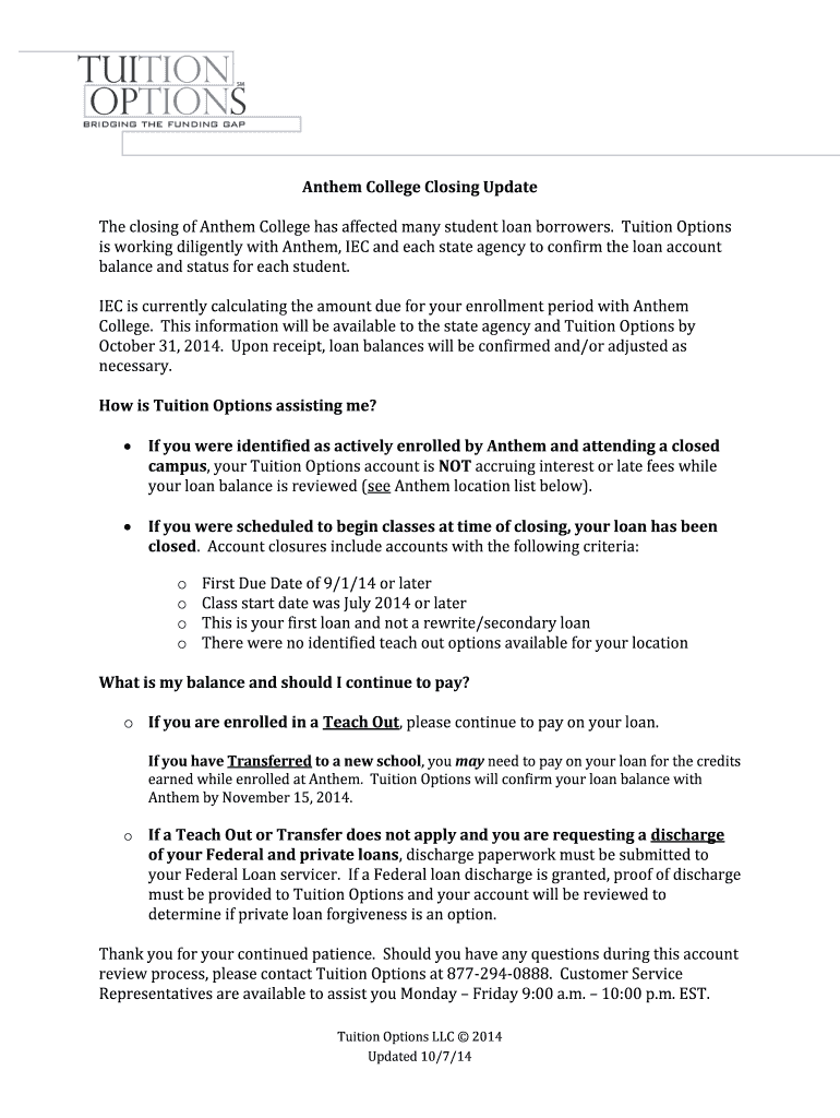 Get the free Anthem College Closing Update The closing of Anthem College has ... - ppse az