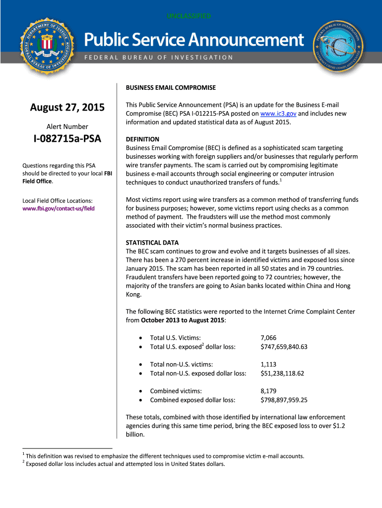 Aug 27, 2015 ... Business Email Compromise (BEC) is defined as a sophisticated scam ... Fraudulent transfers have been reported going to 72 countries; ...
