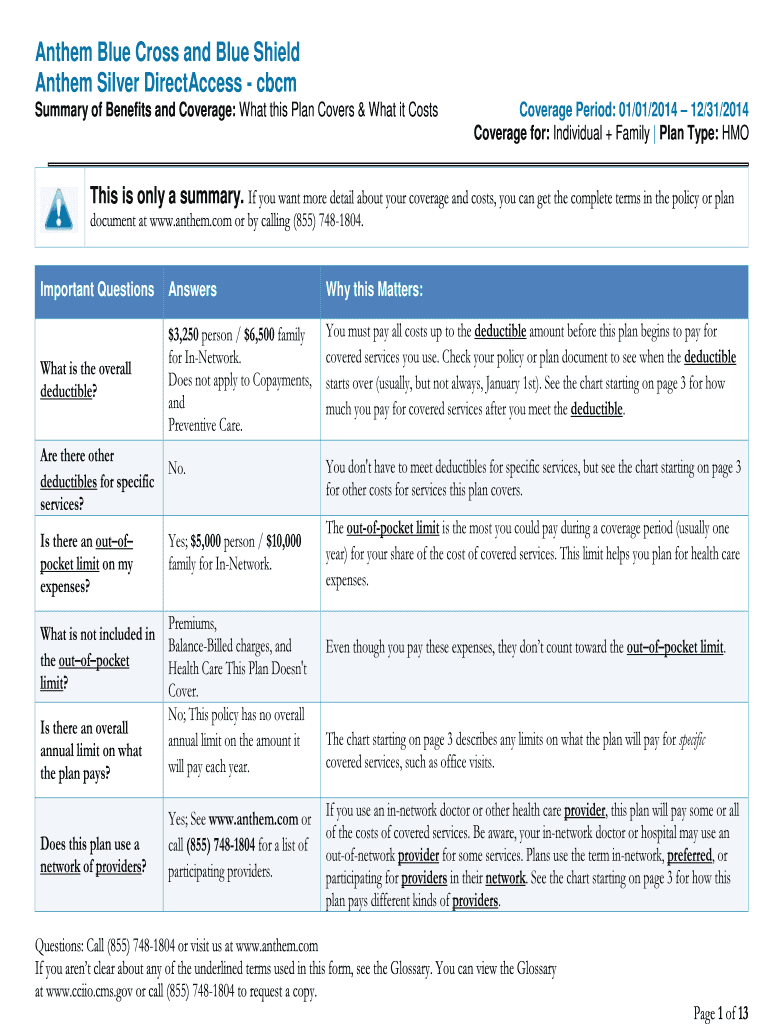 Anthem Blue Cross and Blue Shield Anthem Silver Directness CBC Summary of Benefits and Coverage: What this Plan Covers & What it Costs Coverage Period: 01/01/2014 12/31/2014 Coverage for: Individual