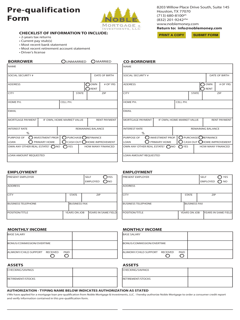 Prequalification Form 8203 Willow Place Drive South, Suite 145 Houston, TX 77070 (713) 6808100ph (832) 2019242efax www.noblemoney.com Return to: info noblemoney.com CHECKLIST OF INFORMATION TO INCLUDE: