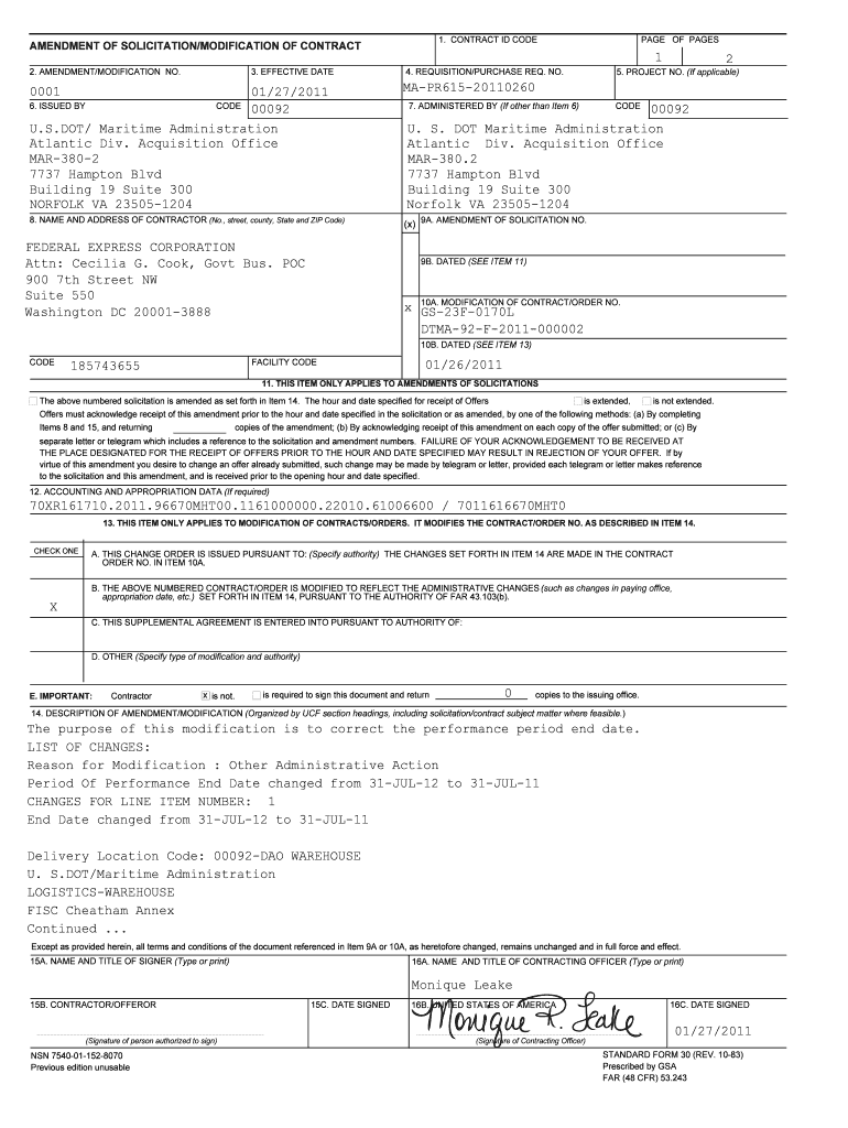 1. CONTRACT ID CODE AMENDMENT OF SOLICITATION/MODIFICATION OF CONTRACT 2. AMENDMENT/MODIFICATION NO. 3. EFFECTIVE DATE 0001 01/27/2011 00092 U.S.DOT/ Maritime Administration Atlantic Div. Acquisition