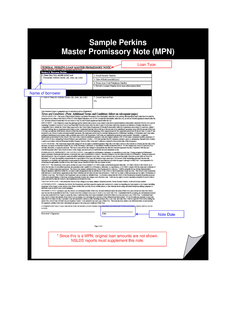 Sample Perkins Master Promissory Note (MPN) Loan Type Name of borrower Note Date * Since this is an MPN, original loan amounts are not shown. HOLDS reports must supplement this note.