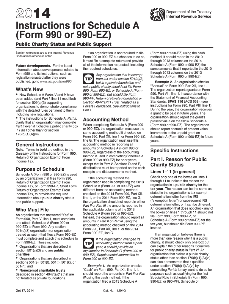 2014. Instructions for Schedule A. (Form 990 or 990-EZ). Public Charity Status and Public Support. Department of the Treasury. Internal Revenue Service.