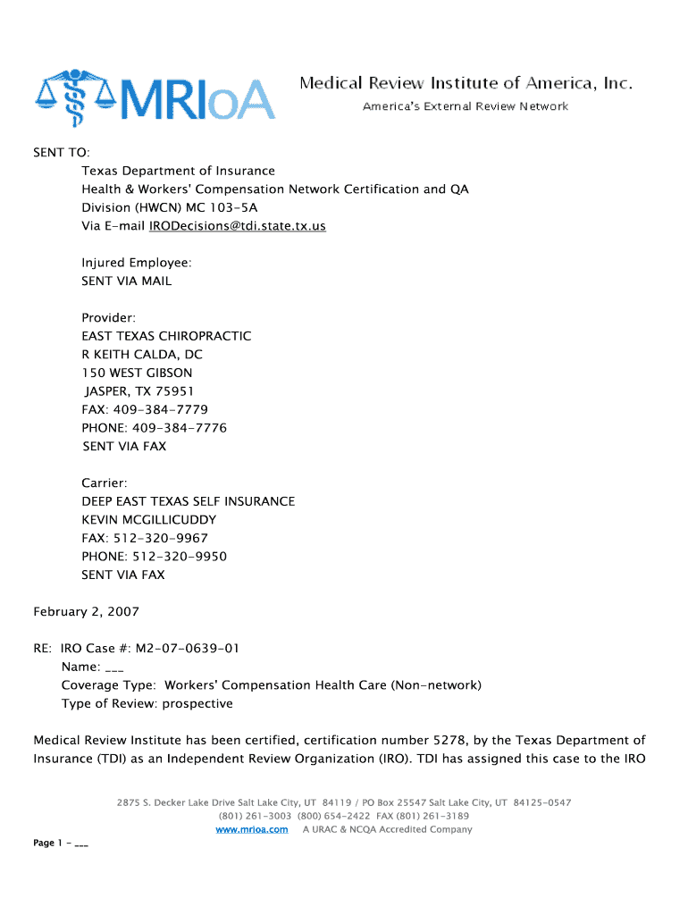 Notice of independent Review Decision SENT TO: Texas Department of Insurance Health & Workers Compensation Network Certification and QA Division (OWN) MC 1035A Via Email Decisions TDI.state.TX.us