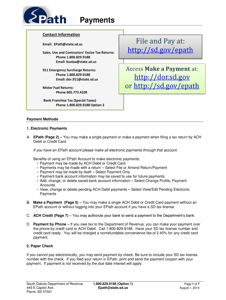 Payments Contact Information Email: Path state.SD.us Sales, Use and Contractors Excise Tax Returns: Phone 1.800.829.9188 Email: bus tax state.SD.us 911 Emergency Surcharge Returns: Phone 1.800.829.9188
