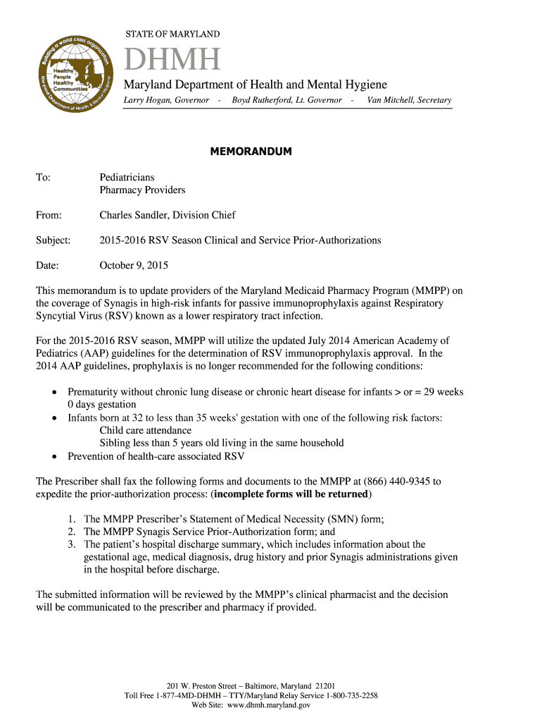 STATE OF MARYLAND DHH Maryland Department of Health and Mental Hygiene Larry Hogan, Governor Boyd Rutherford, Lt. Governor Van Mitchell, Secretary MEMORANDUM To: Pediatricians Pharmacy Providers From: