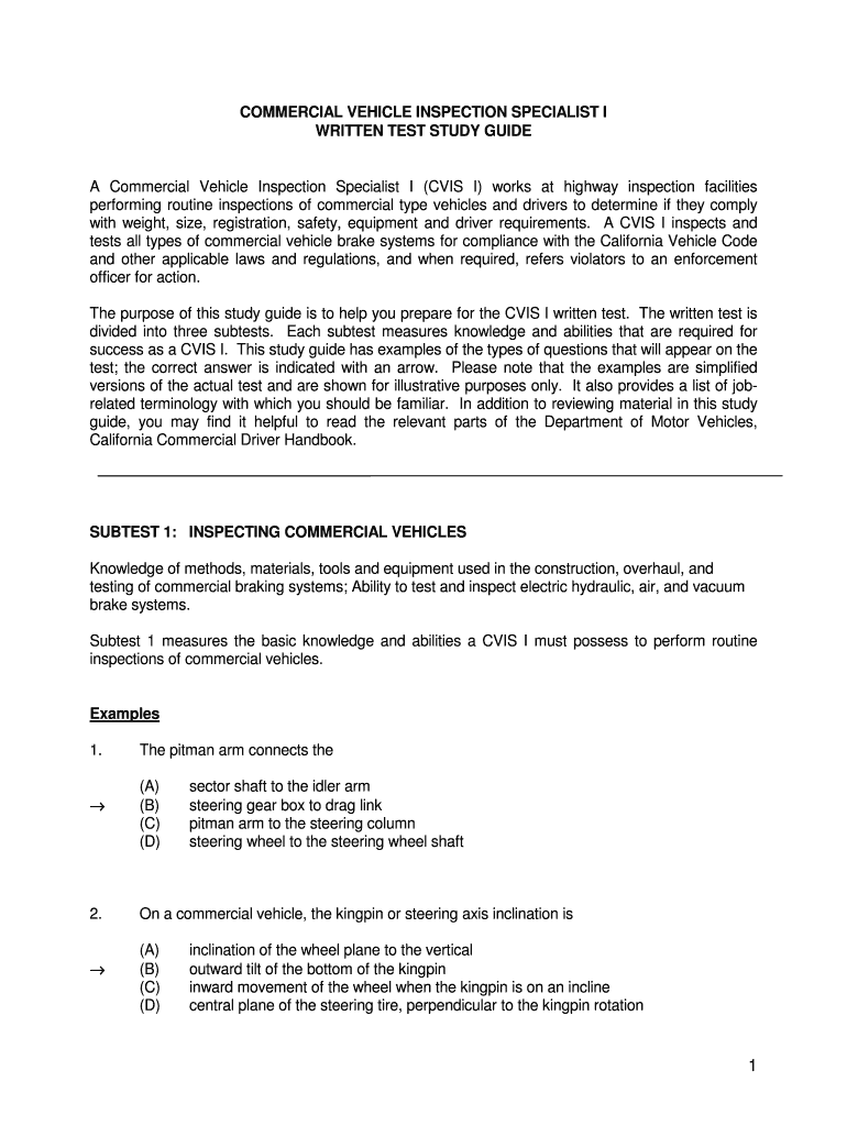 COMMERCIAL VEHICLE INSPECTION SPECIALIST I Have WRITTEN TEST STUDY GUIDE A Commercial Vehicle Inspection Specialist I (CVS I) works at highway inspection facilities performing routine inspections