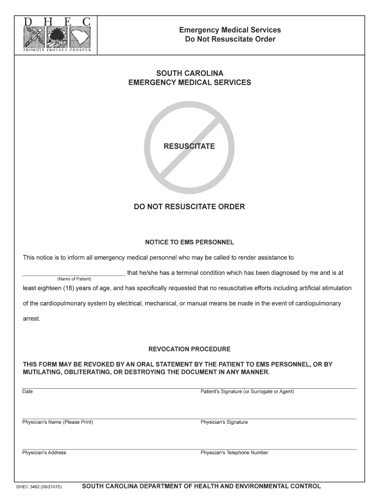 DEC 3462 (09/21015). SOUTH CAROLINA DEPARTMENT OF HEALTH AND ENVIRONMENTAL CONTROL. Emergency Medical Services. Do Not ...