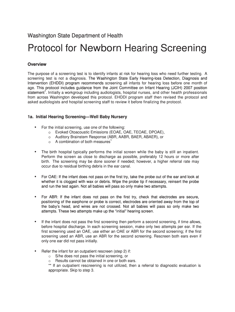Washington State Department of Health Protocol for Newborn Hearing Screening Overview The purpose of a screening test is to identify infants at risk for hearing loss who need further testing. A screening