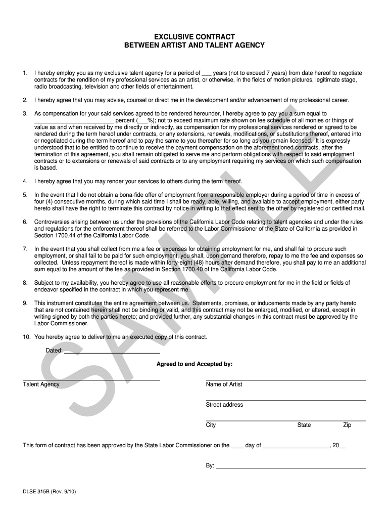 EXCLUSIVE CONTRACT BETWEEN ARTIST AND TALENT AGENCY 1. I hereby employ you as my exclusive talent agency for a period of years (not to exceed 7 years) from date hereof to negotiate contracts for the