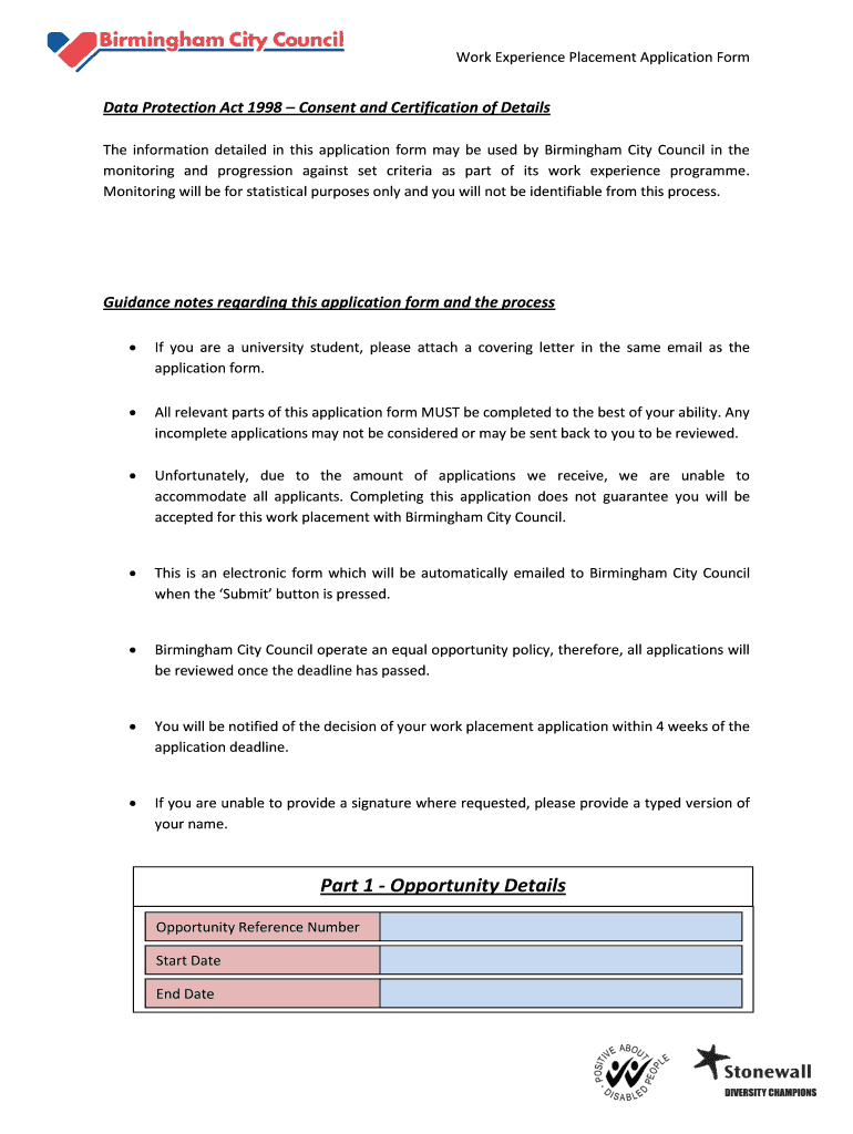 Work Experience Placement Application Form Data Protection Act 1998 Consent and Certification of Details The information detailed in this application form may be used by Birmingham City Council in