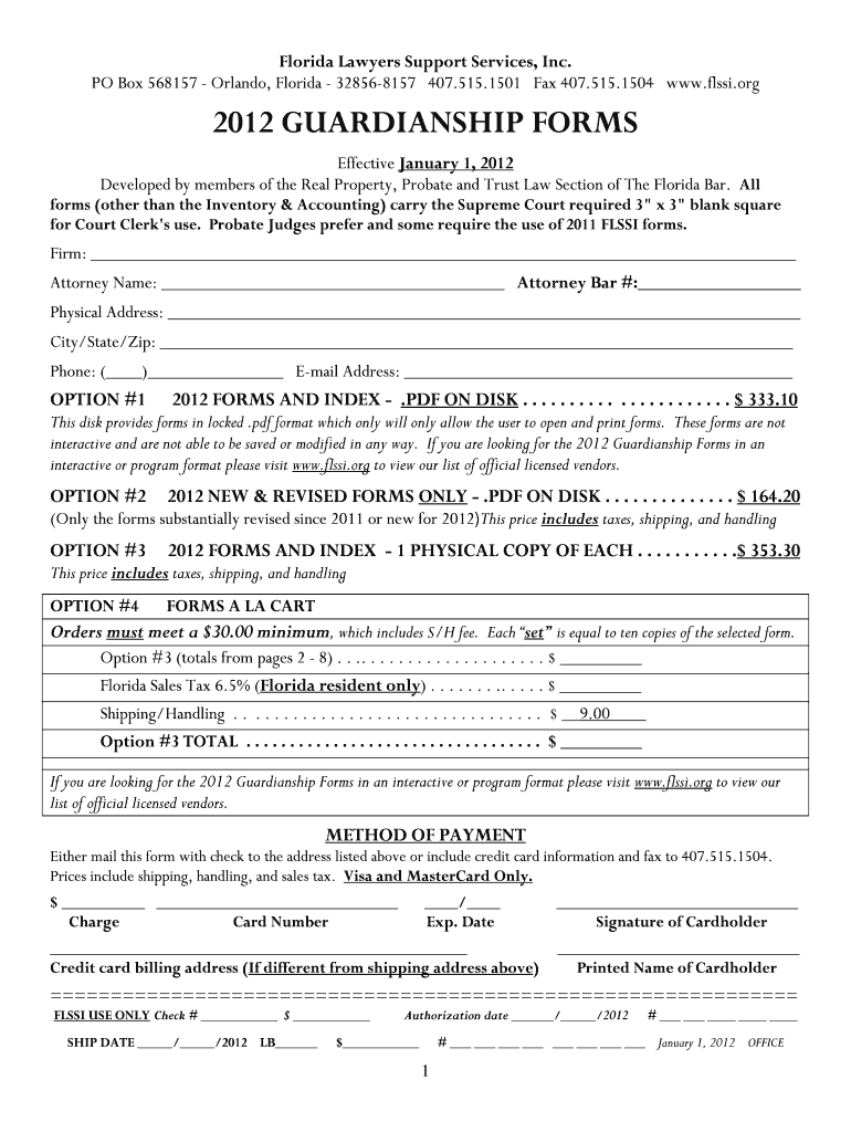 Florida Lawyers Support Services, Inc. PO Box 568157 Orlando, Florida 328568157 407.515.1501 Fax 407.515.1504 www.flssi.org 2012 GUARDIANSHIP FORMS Effective January 1, 2012, Developed by members