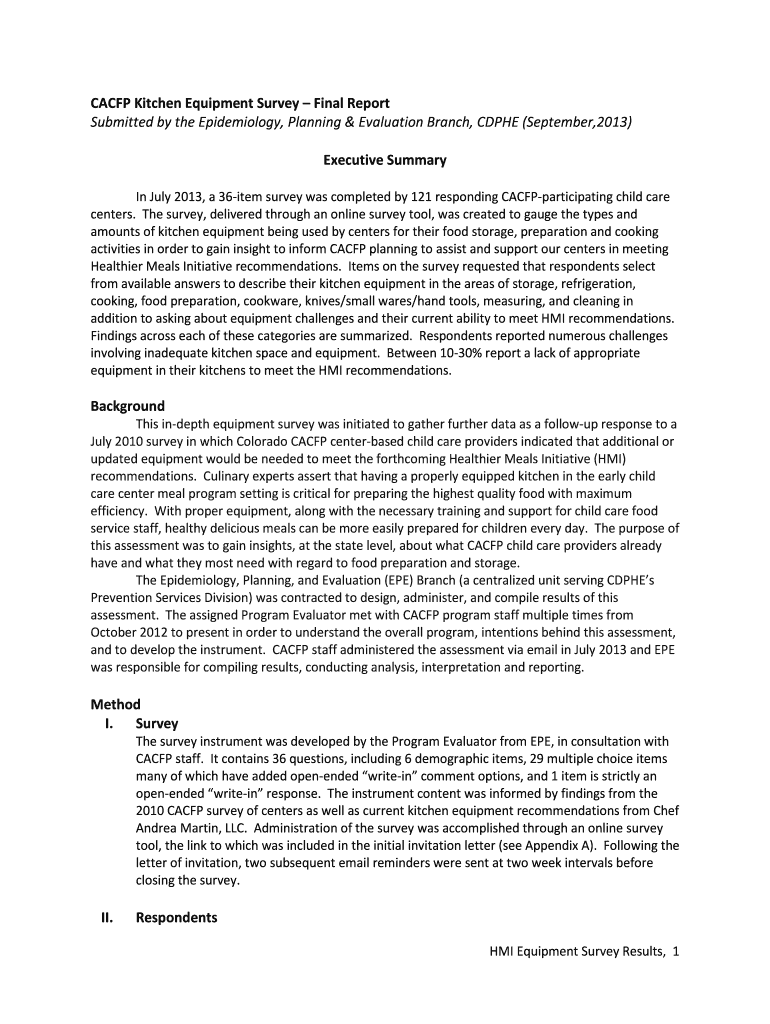 CA CFP Kitchen Equipment Survey Final Report Submitted by the Epidemiology, Planning & Evaluation Branch, CACHE (September 2013) Executive Summary In July 2013, a 36item survey was completed by 121