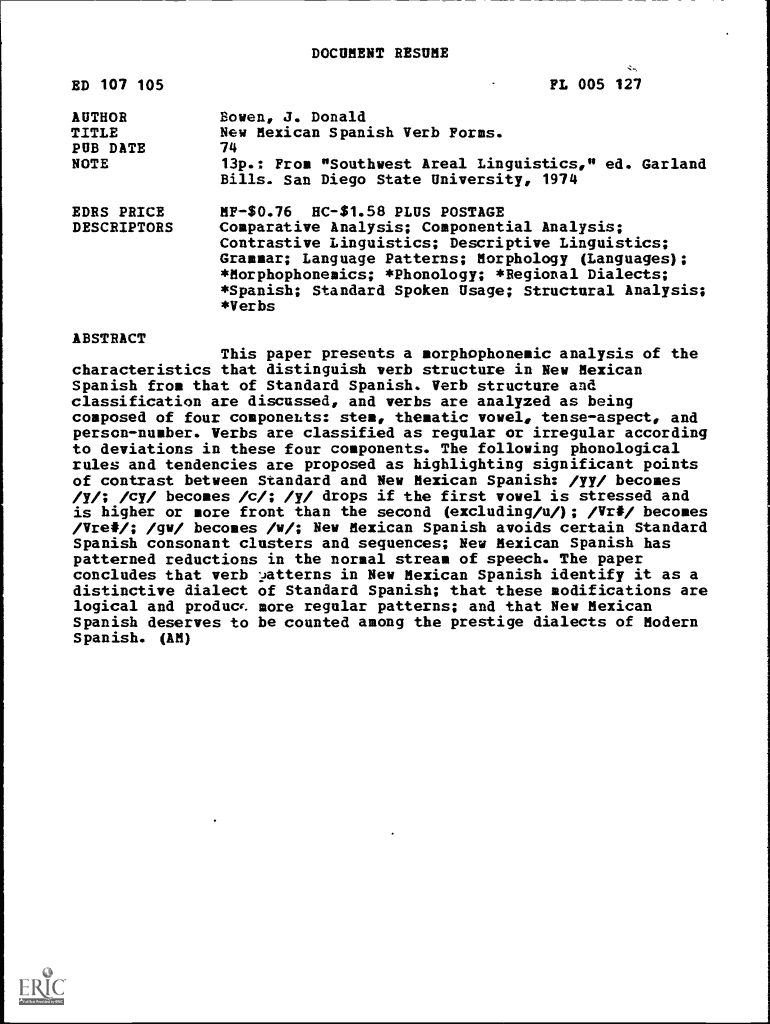 DOCUMENT RESUME FL 005 127 ED 107 105 AUTHOR TITLE PUB DATE NOTE Bowen, J. Donald New Mexican Spanish Verb Forms. EARS PRICE DESCRIPTORS MF$0.76 HC$1.58 PLUS POSTAGE Comparative Analysis; Component