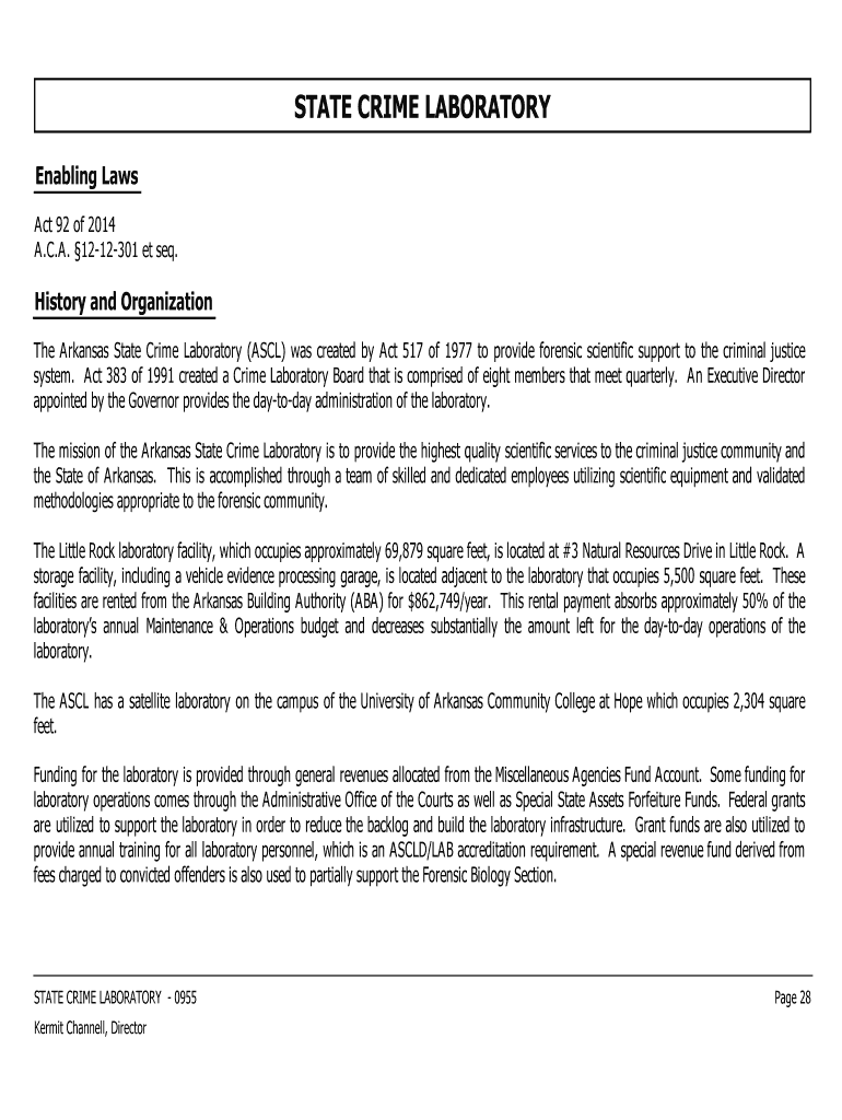 STATE CRIME LABORATORY Enabling Laws Act92of2014 A.C.A.1212301etseq. History and Organization The Arkansas State Crime Laboratory (ACL) was created by Act 517 of 1977 to provide forensic scientific