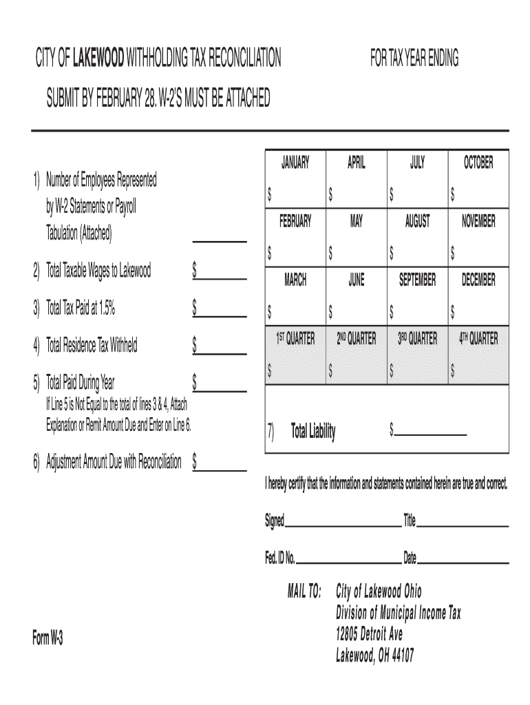 CITY OF LAKEWOOD WITHHOLDING TAX RECONCILIATION SUBMIT BY FEBRUARY 28. W2S MUST BE ATTACHED APRIL JANUARY 1) Number of Employees Represented by W2 Statements or Payroll Tabulation (Attached) $ $ $3)