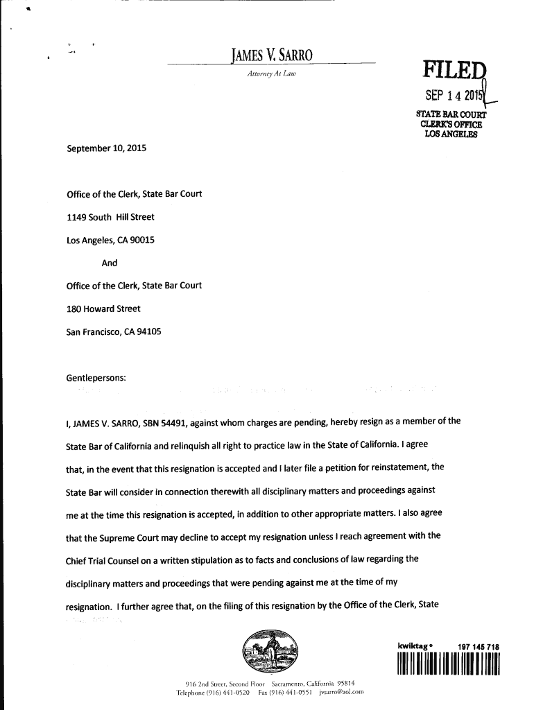 AMES V. S DLR FILED Attorney At Law 8EP i September 10, 2015, Office of the Clerk, State Bar Court 1149 South Hill Street Los Angeles, CA 90015 And Office of the Clerk, State Bar Court 180 Howard