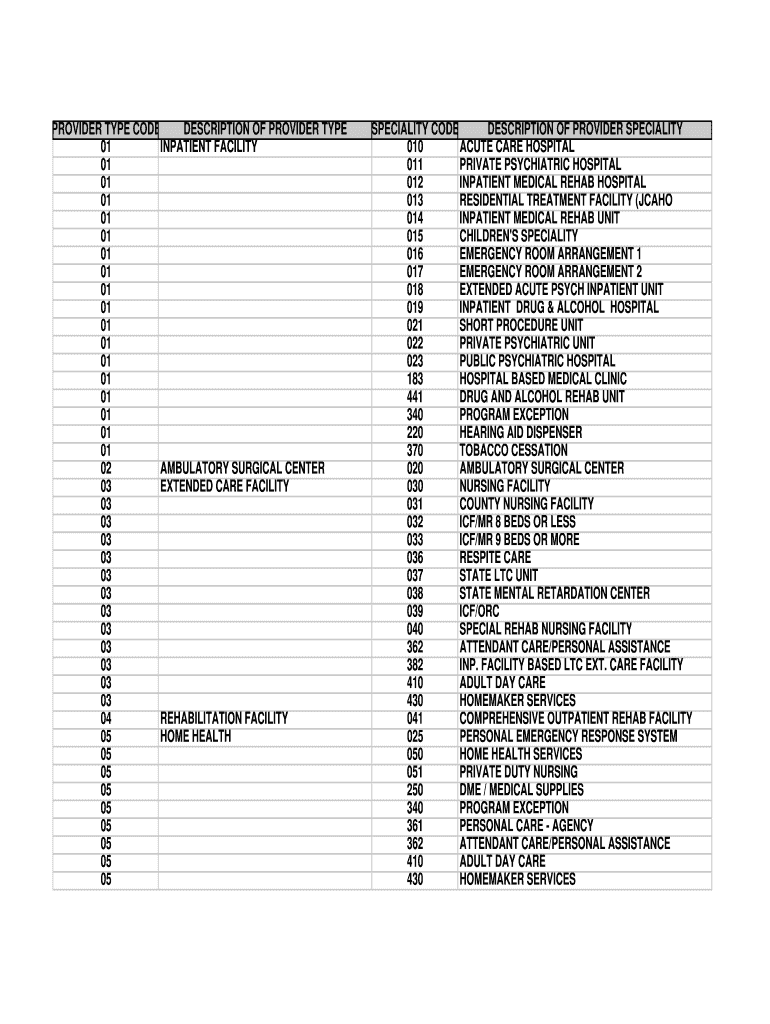PROVIDER TYPE CODE DESCRIPTION OF PROVIDER TYPE 01 INPATIENT FACILITY 01 01 01 01 01 01 01 01 01 01 01 01 01 01 01 01 01 02 AMBULATORY SURGICAL CENTER 03 EXTENDED CARE FACILITY 03 03 03 03 03 03 03