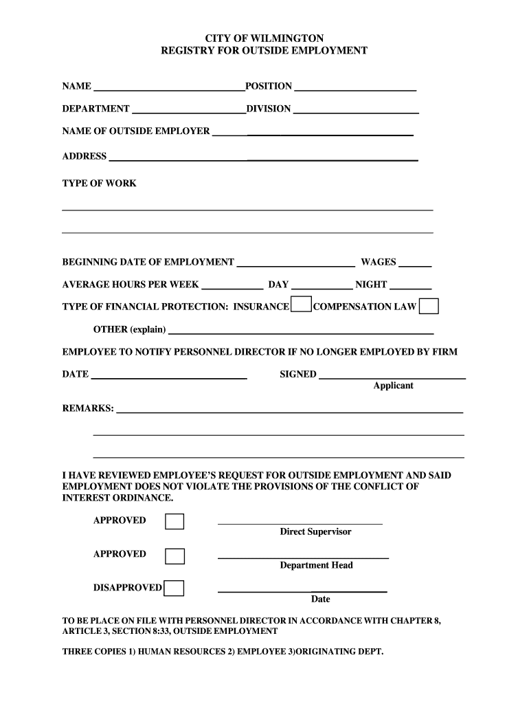 CITY OF WILMINGTON REGISTRY FOR OUTSIDE EMPLOYMENT NAME POSITION DEPARTMENT DIVISION NAME OF OUTSIDE EMPLOYER ADDRESS TYPE OF WORK BEGINNING DATE OF EMPLOYMENT AVERAGE HOURS PER WEEK WAGES DAY TYPE