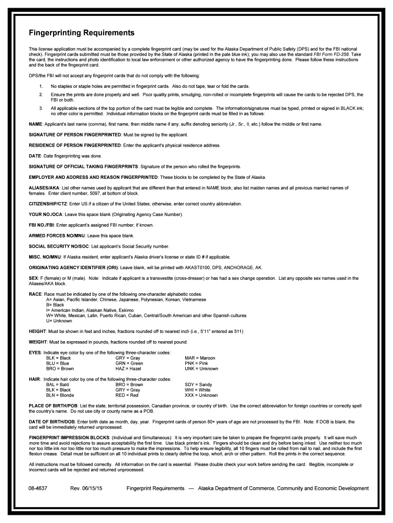 This license application must be accompanied by a complete fingerprint card (maybe used for the Alaska Department of Public Safety (DPS) and for the FBI national